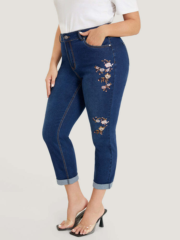 Straight Leg Very Stretchy Dark Wash Floral Embroidered Jeans