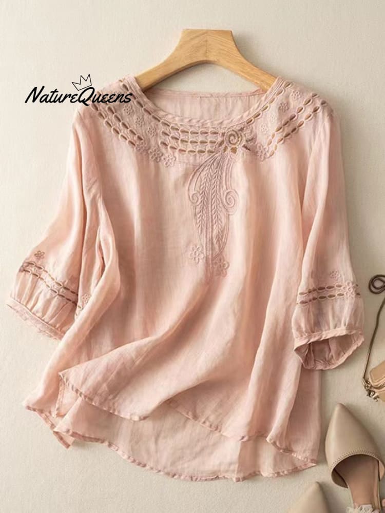 Women's V-neck Half Sleeve Embroidered Cardigan Buttoned Casual Linen Top