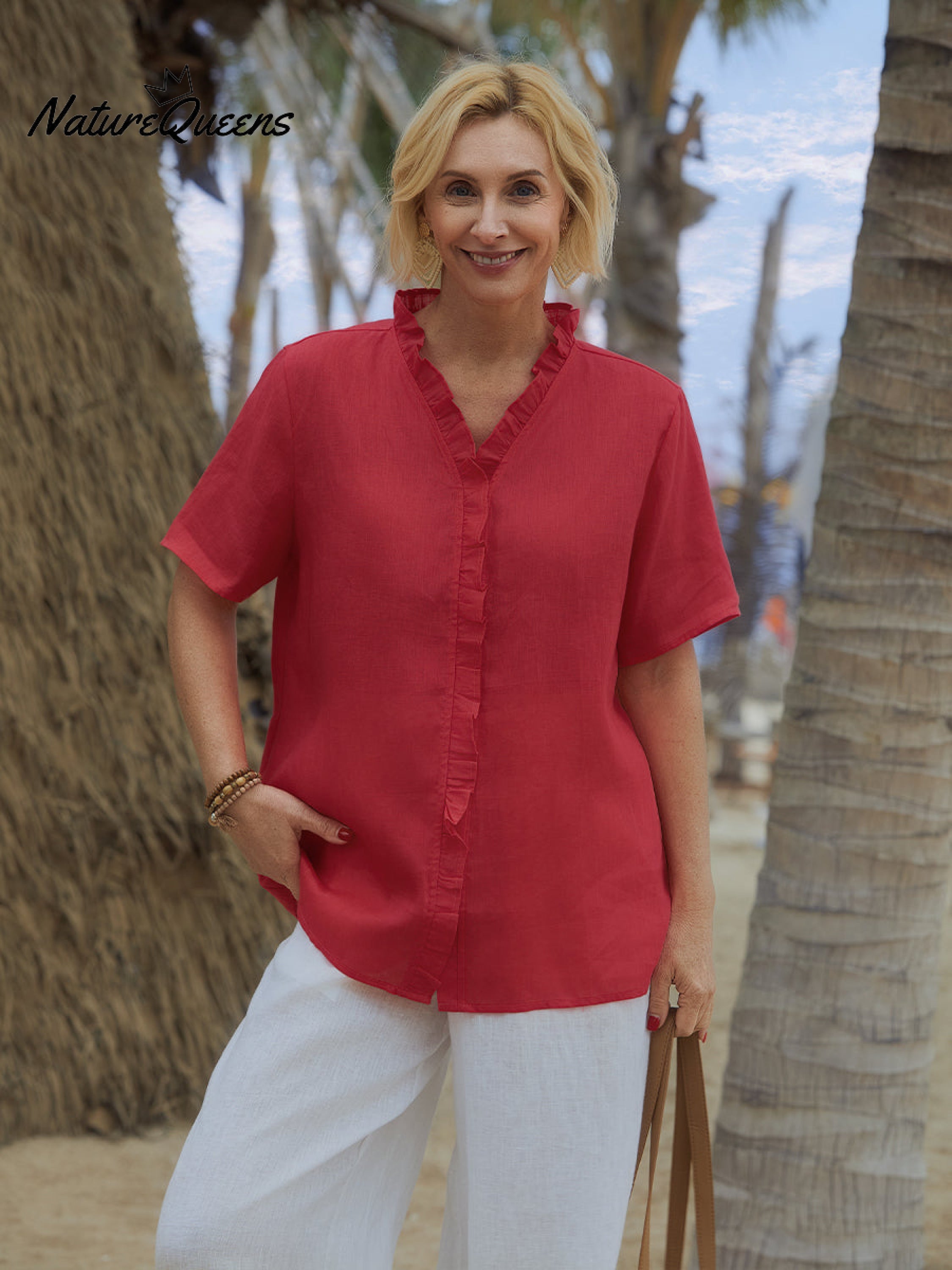 Women's Casual Short Sleeve 100% Linen Ruffle Shirt
