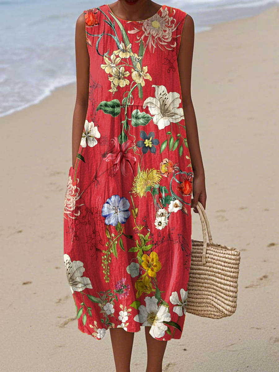 Women's Vintage Floral Pattern Art Print Sleeveless Cotton Pocket Wrap Dress