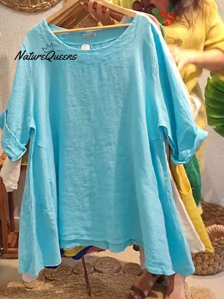 Women's Solid Color Round Neck Half Sleeves Casual Loose Pocket Linen Tops