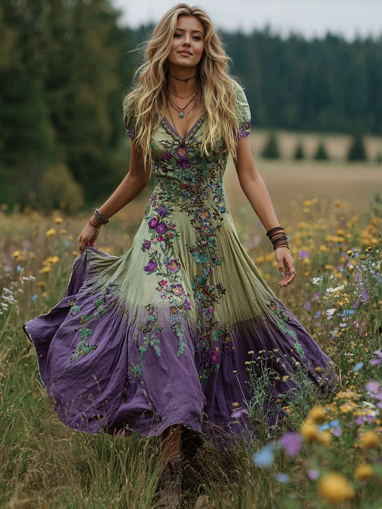 Vintage Gradient Purple Floral Embroidered Linen Short Sleeve Maxi Dress
