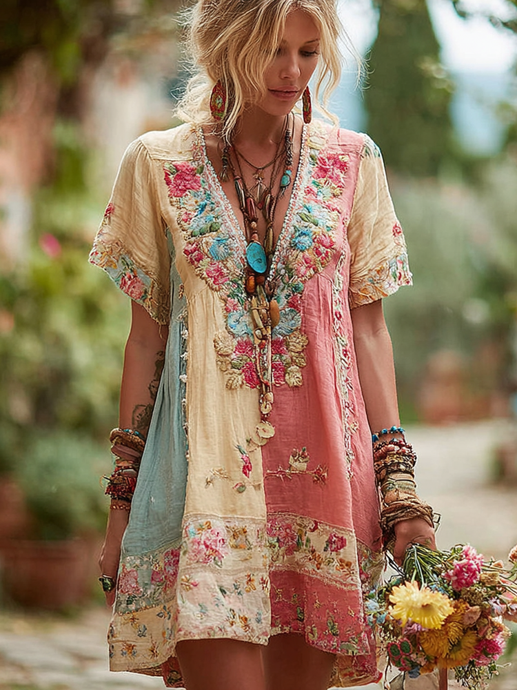 Vintage Embroidered Floral Plaid Patchwork Mini Dress