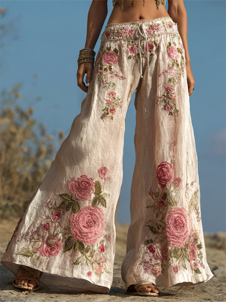 Boho Pink Roses Embroidered Flowy Wide Leg Linen Pants