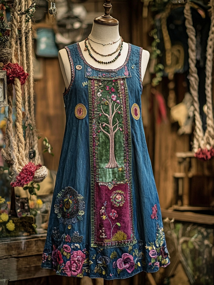 Women's Vintage Denim Velvet Tree Panel Sleeveless Dress