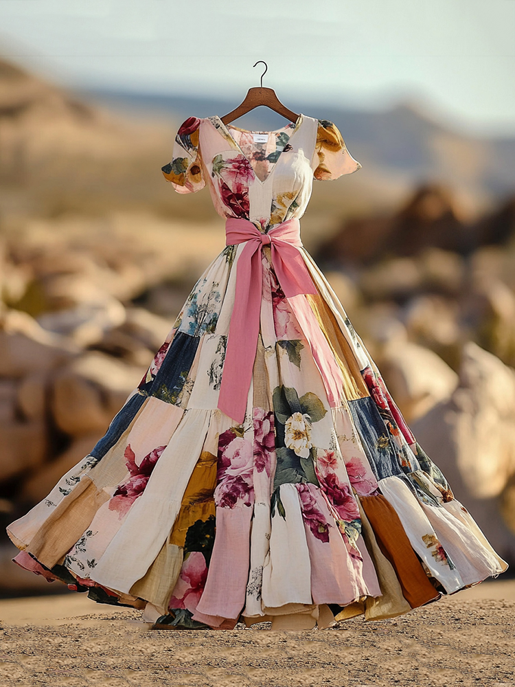 Women's Retro Floral Splicing Cotton And Linen Long Dress