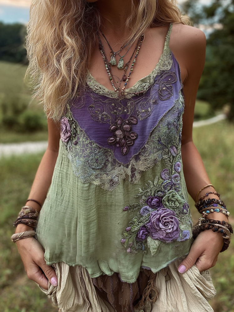 Vintage Purple Lavender And Floral Embroidered Linen V-neck Camisole