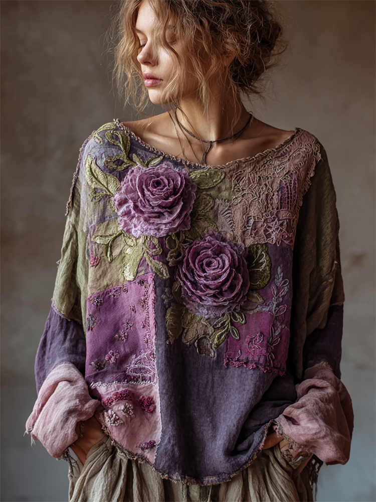 Vintage Purple Roses Boho Patchwork Linen Tunic