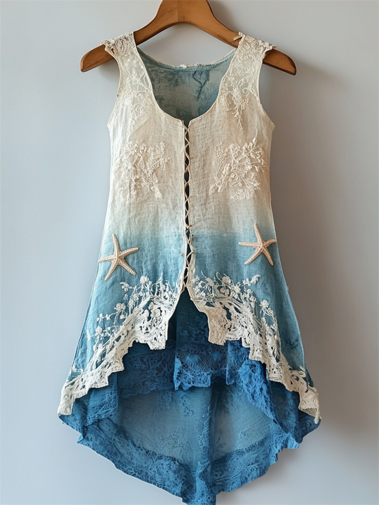 Starfish Embroidered Sea Waves Lace Layered Flowy Linen Tank