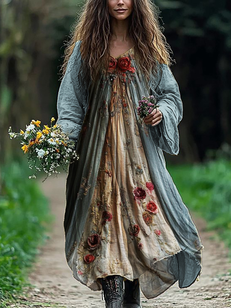 Vintage Roses Floral Flowy Linen Blend Maxi Dress
