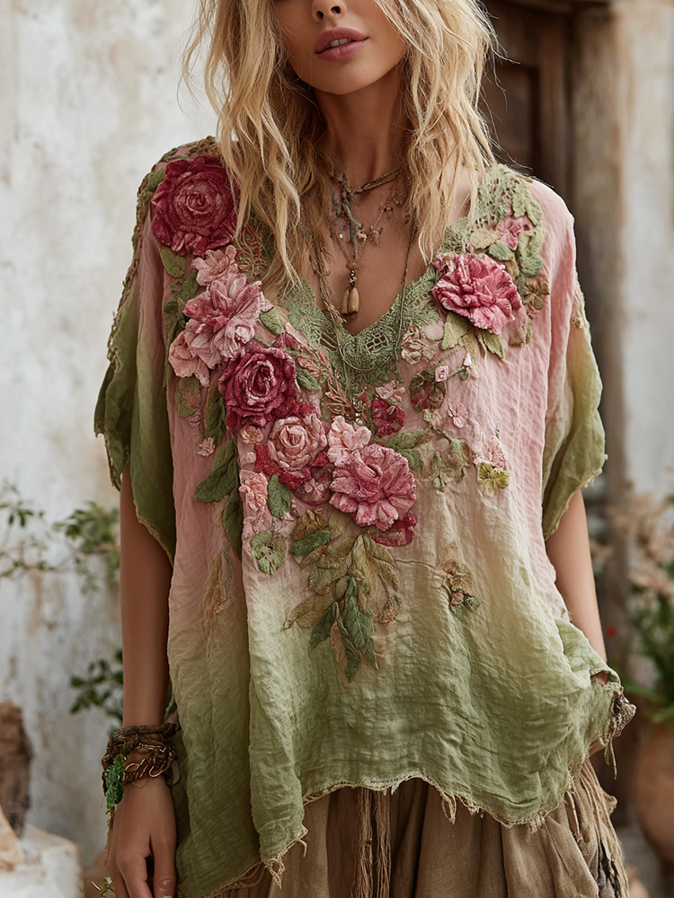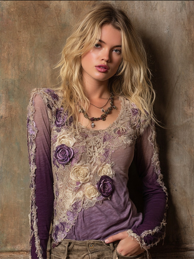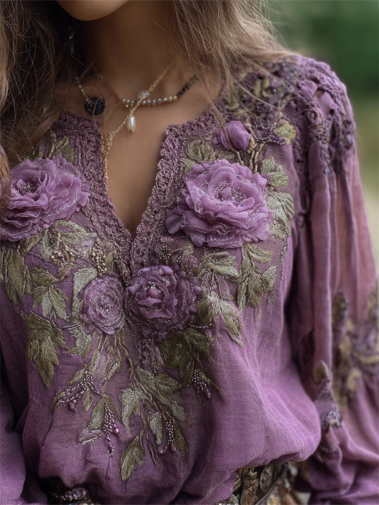 Elegant Boho Purple Roses Embroidered Gradient Linen T Shirt