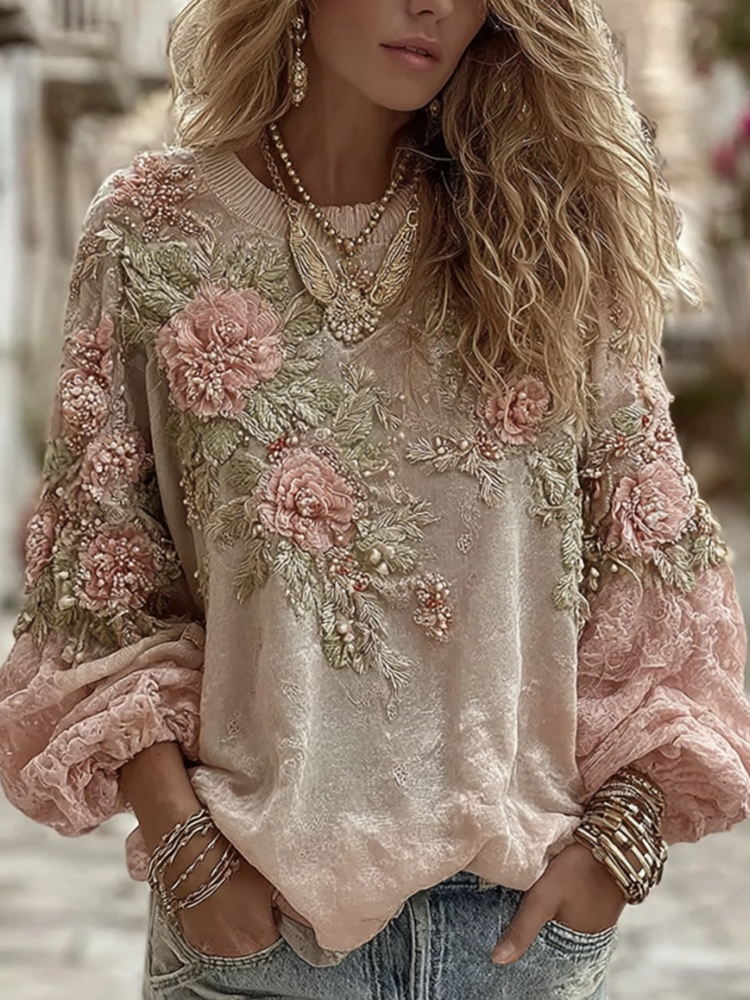Women's Vintage Pink Rose Embroidery Casual Crew Neck Shirt