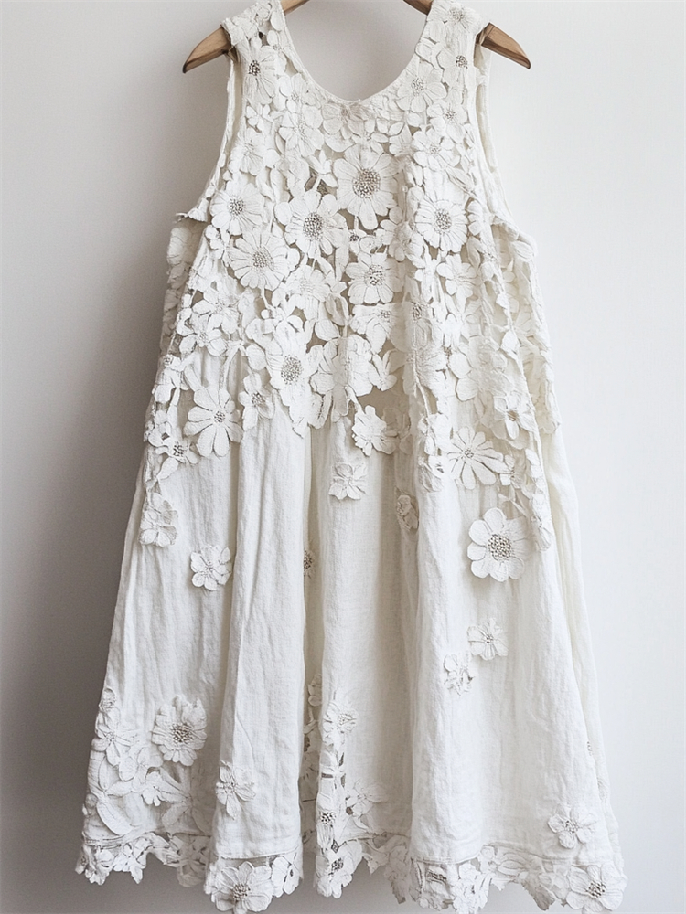 Classy 3d Floral Hollow Lace Patchwork Linen Tank Dress