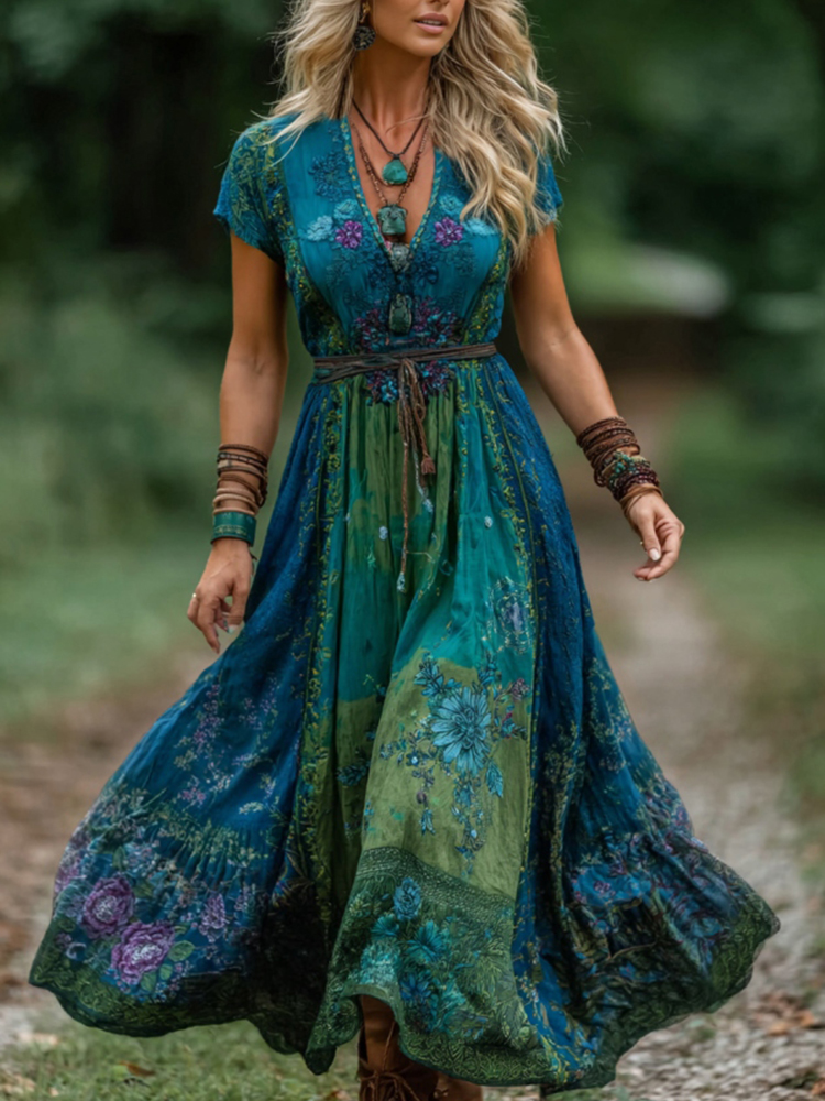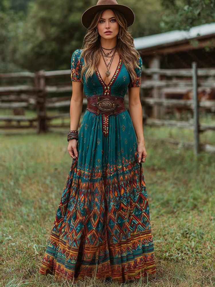 Women's Vintage Western Geometric Print V-neck Short Sleeve Maxi Dress