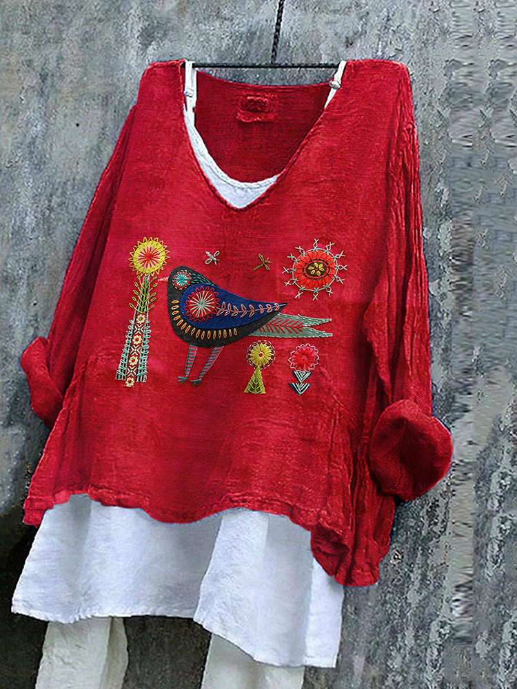 Women's Flower And Bird Embroidery Art Linen V-neck Shirt