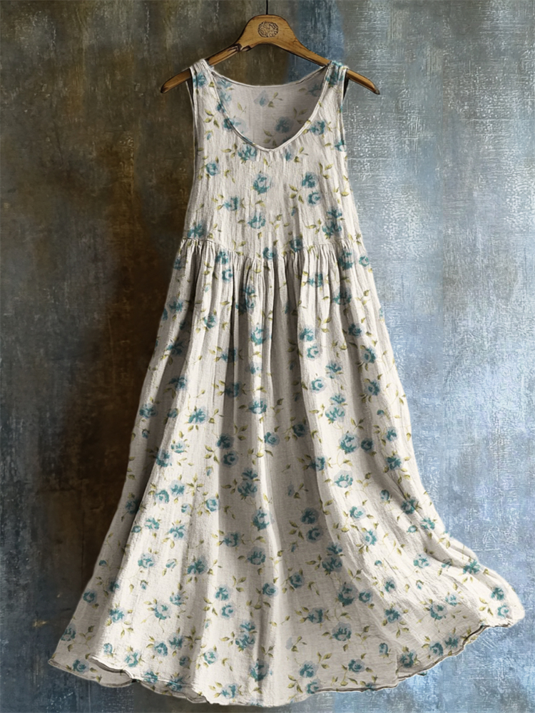 Vintage Cottagecore Blue Floral Linen Tank Dress