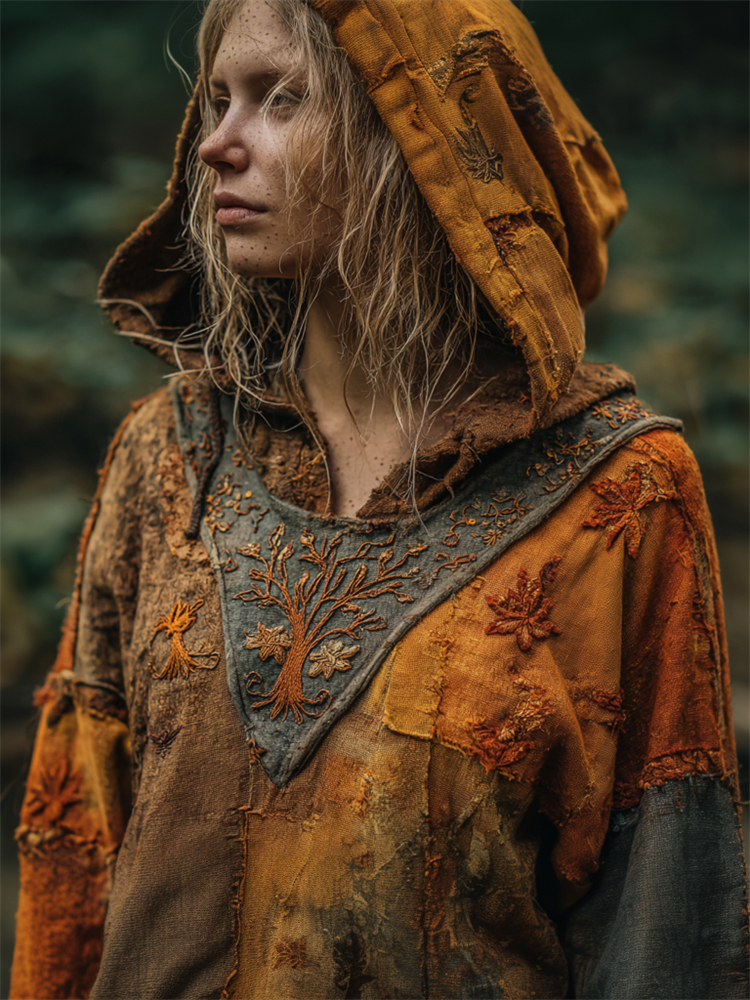 Vintage Fall Tree Of Life Embroidered Patchwork Hoodie
