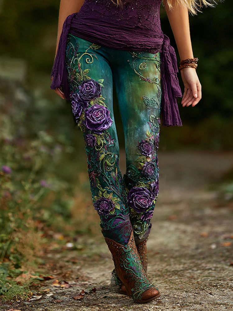 Women's Vintage Rose Floral Pattern Skinny Pants