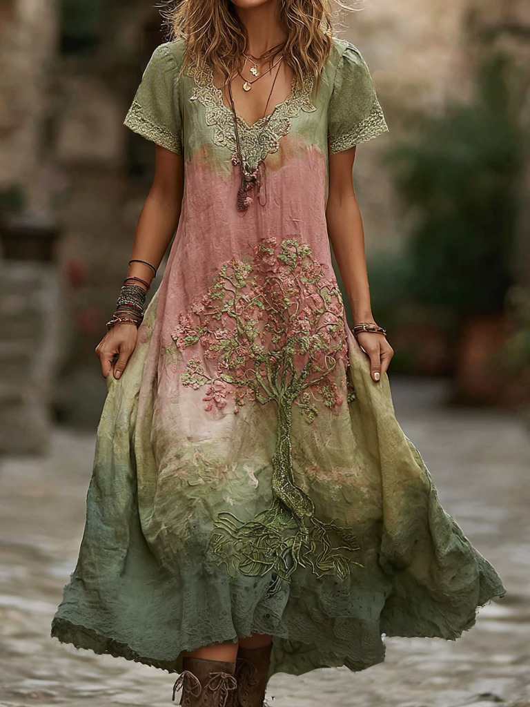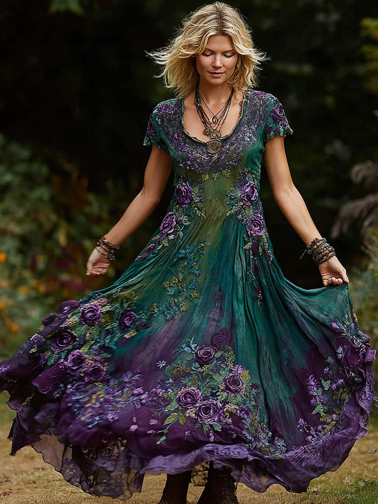 Women's Vintage Floral Embroidery Gradient Pattern Round Neck Dress