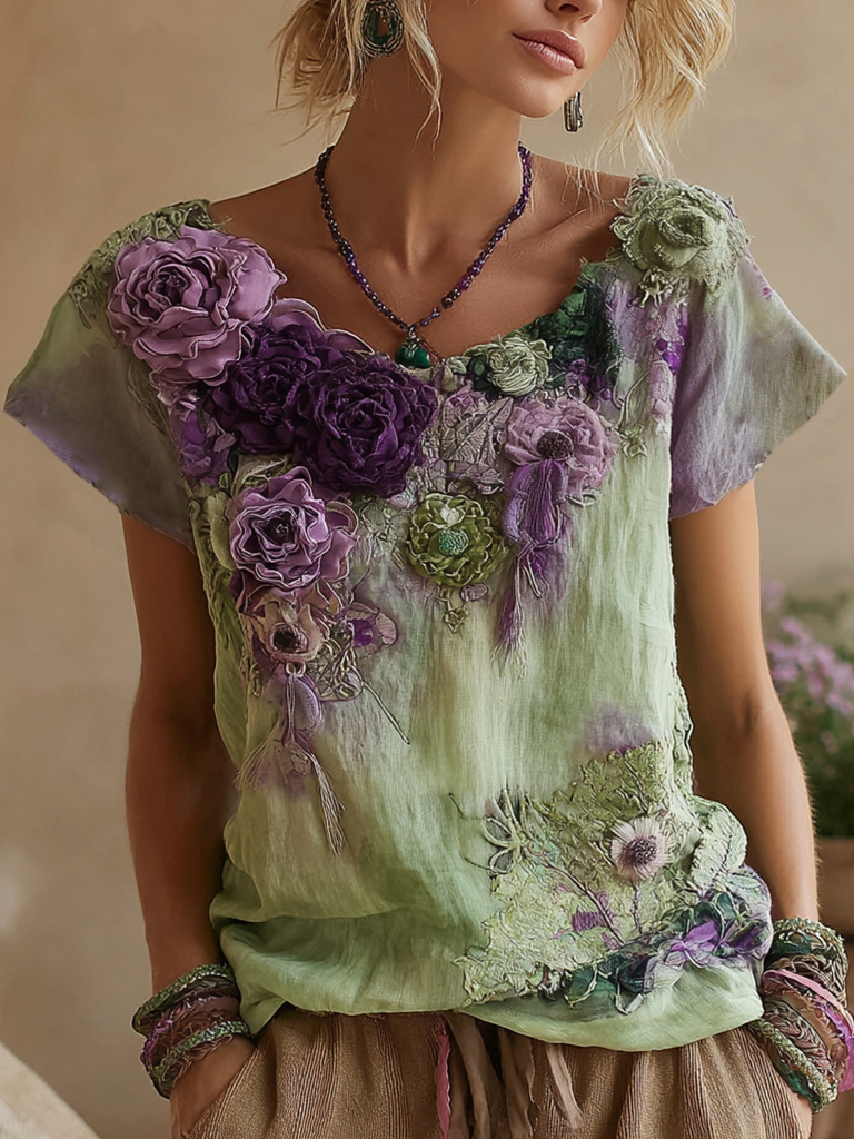 Women's Bohemian Floral Embroidery Patchwork Art Round Neck Short Sleeve Linen Blend T-shirt