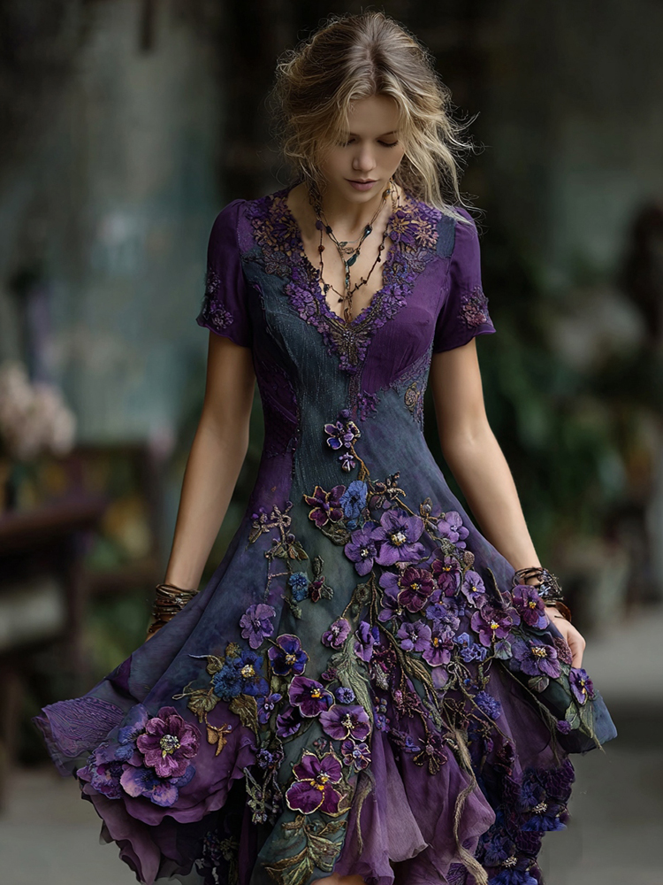 Women's Retro Embroidered Pansy Flowers Short-sleeved Midi Dress