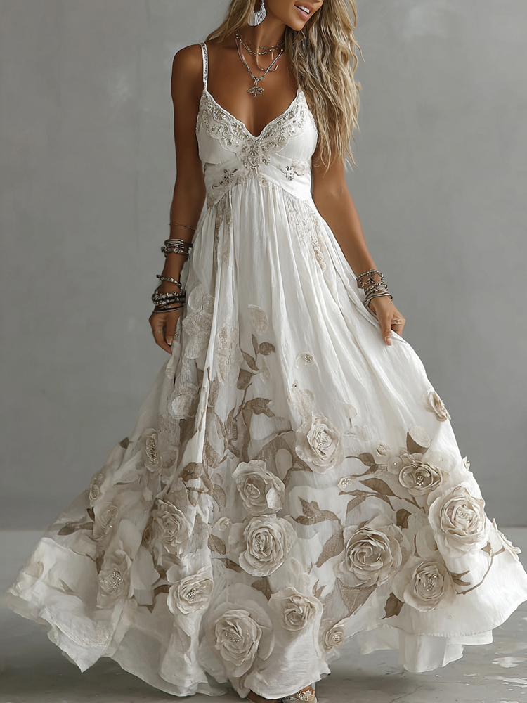 Women's Vintage Rose Embroidery Art V-neck Suspender Maxi Dress