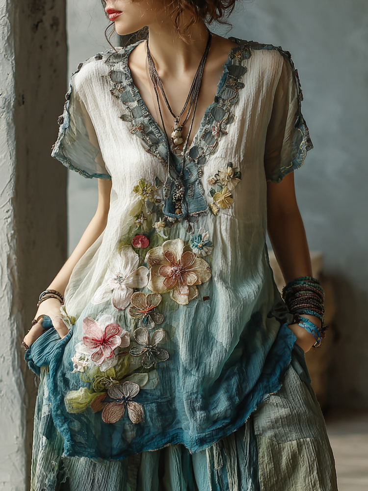 Bohemian Style Flower Embroidery, Light And Thin Sequin, Vintage V-neck Short-sleeved Shirt
