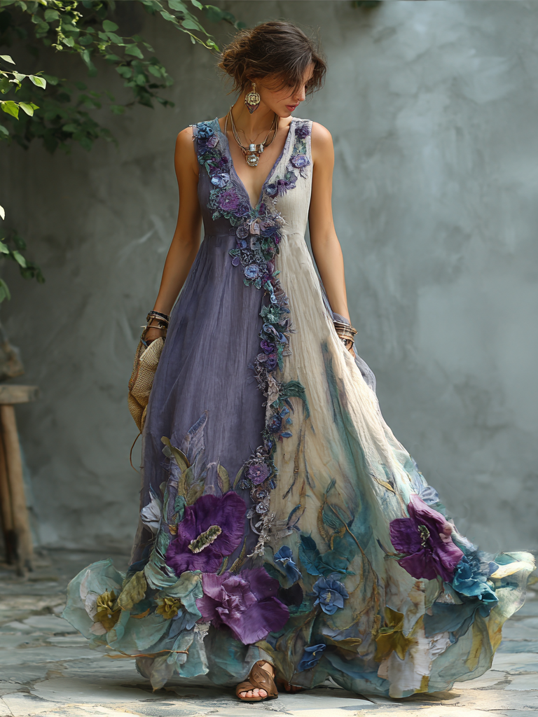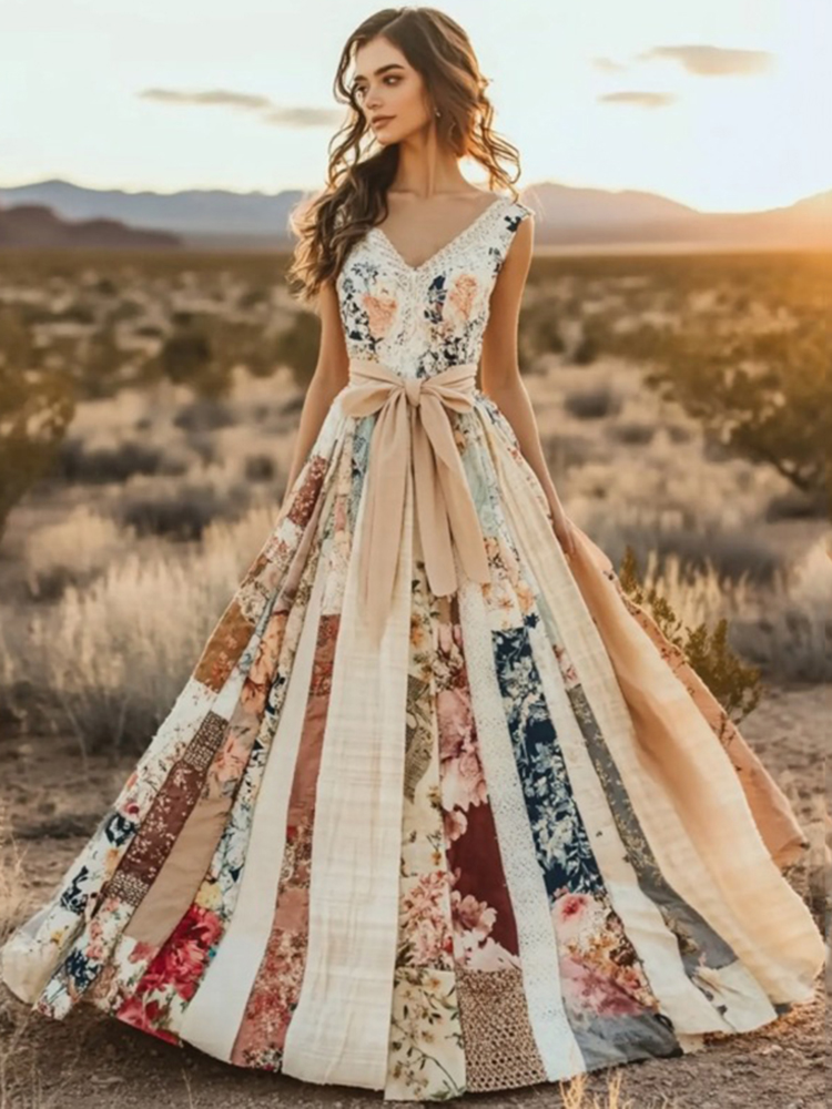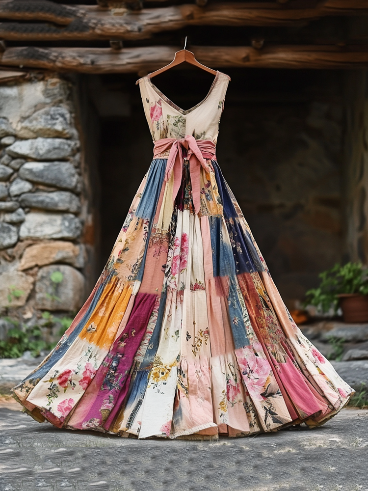 Women's Vintage Floral Patchwork Art V Neck Maxi Dress