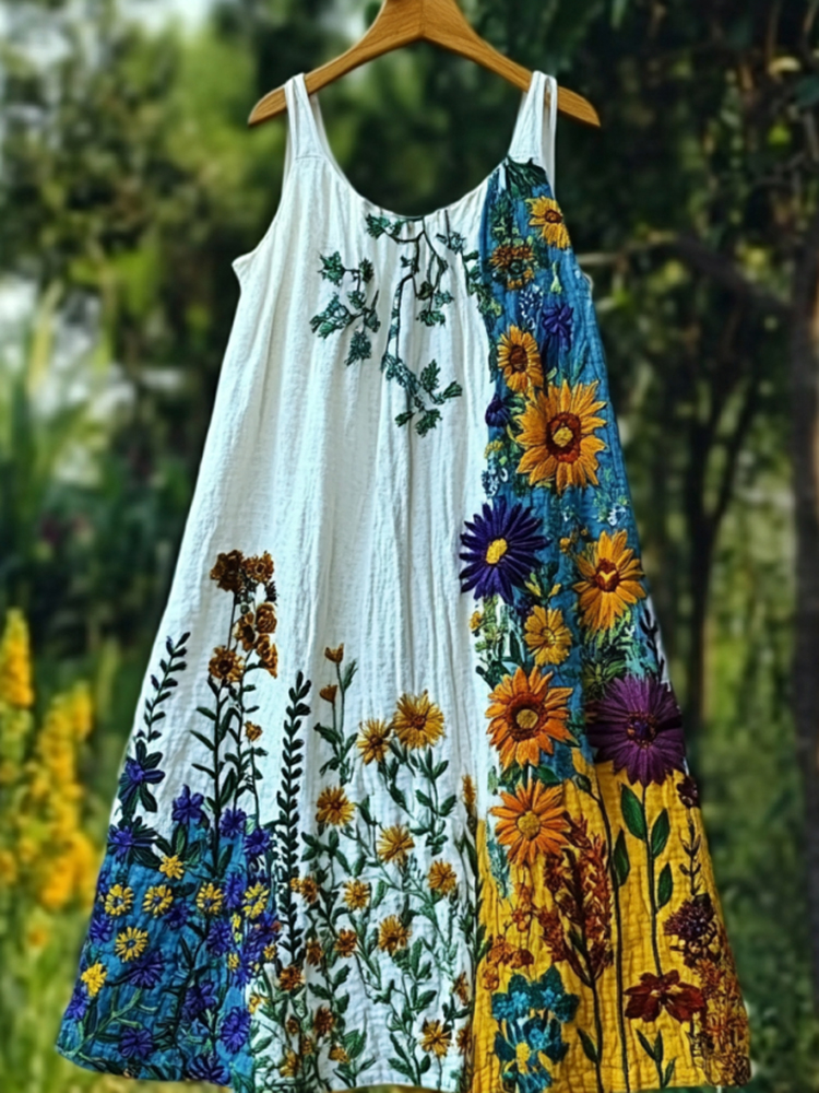 Vintage Loose Floral Patchwork Art Linen Tank Dress