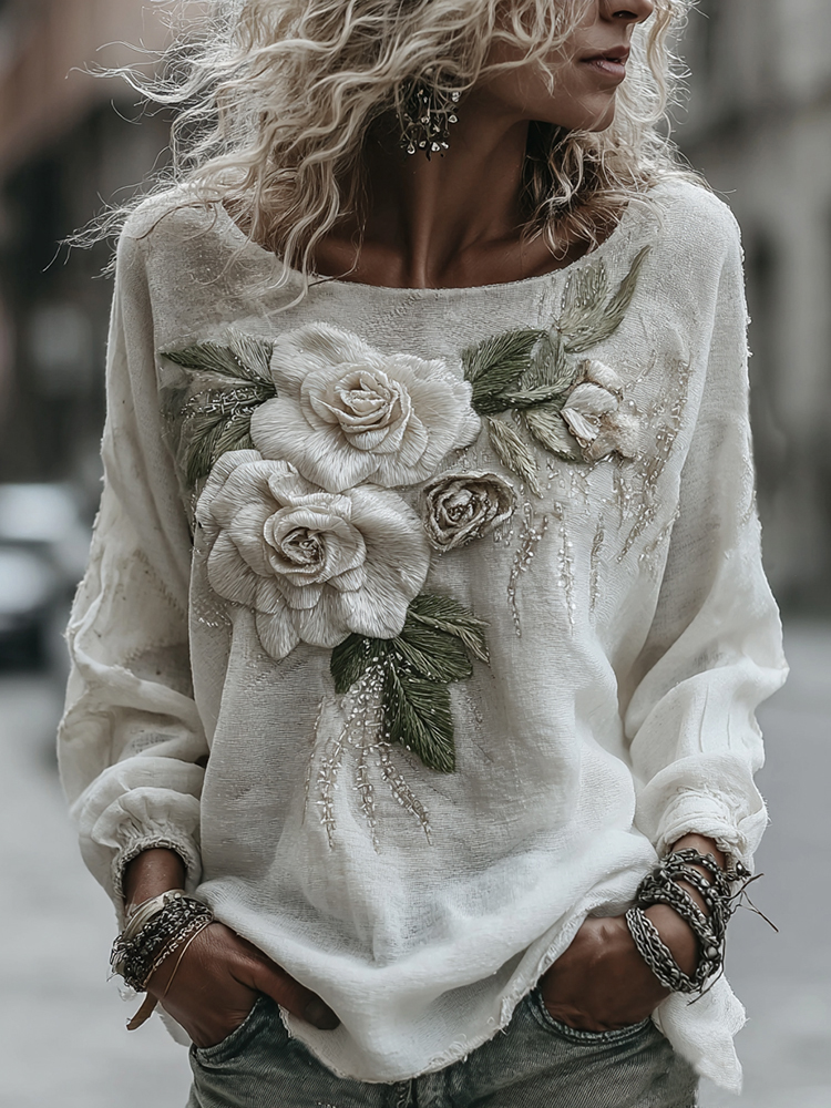 Women's Classic Romantic White Rose Embroidery Art Comfy Linen Long Sleeve Shirts