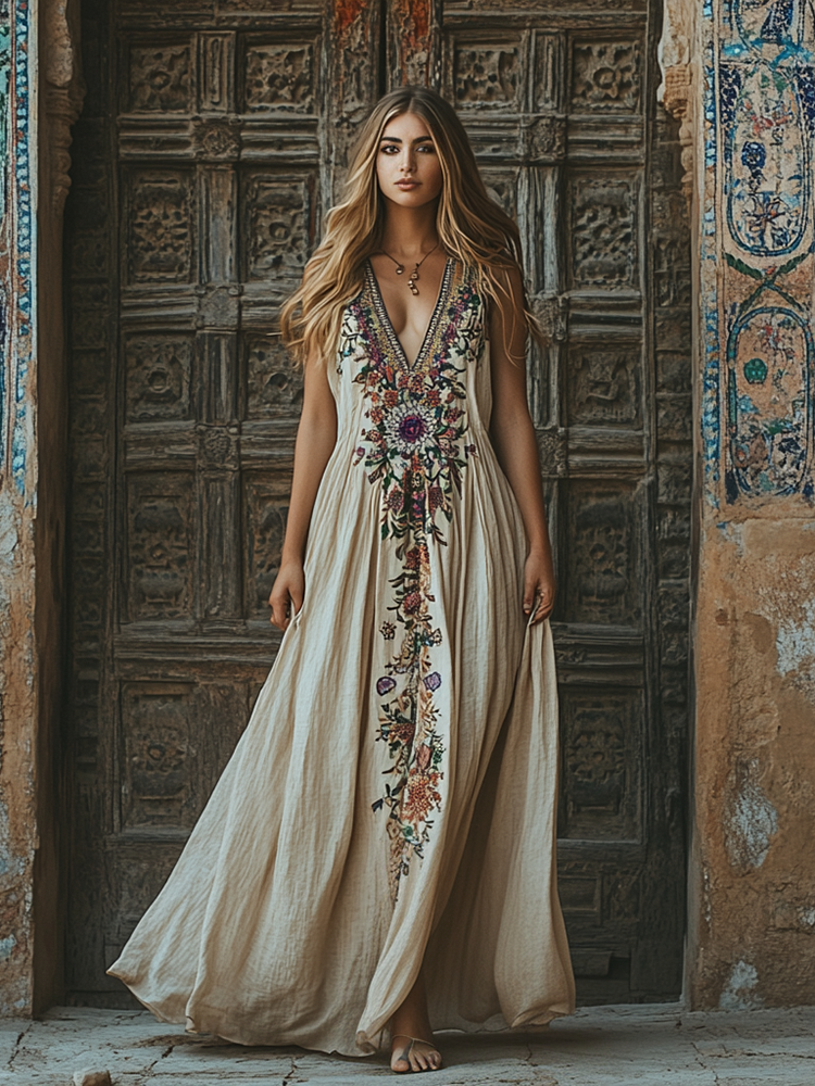 Vintage Floral Art Embroidery Linen V-neck Midi Dress