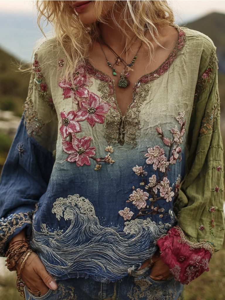 Vintage Gradient Japanese Sakura Cherry Blossoms And Sea Wave Embroidered Pattern Linen Long Sleeve Shirt