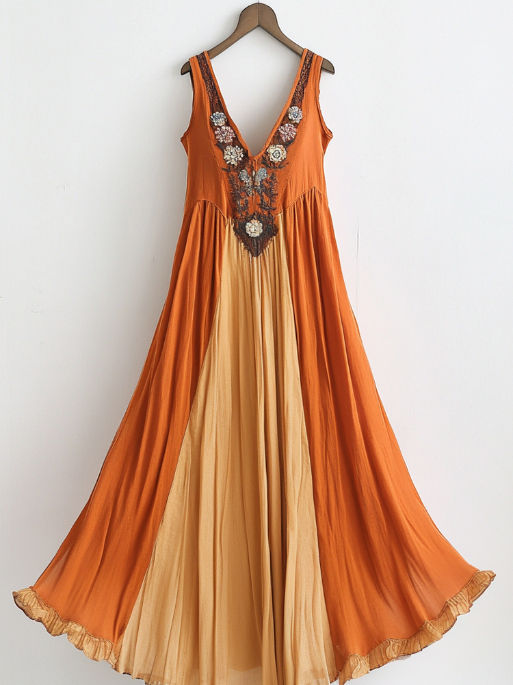Vintage Tribal Floral Art Color Block Sleeveless Maxi Dress