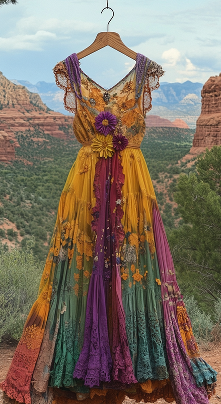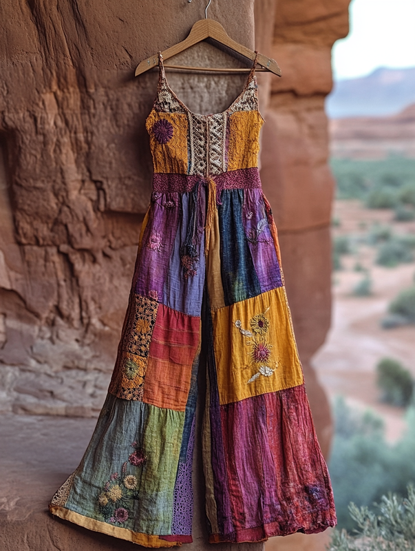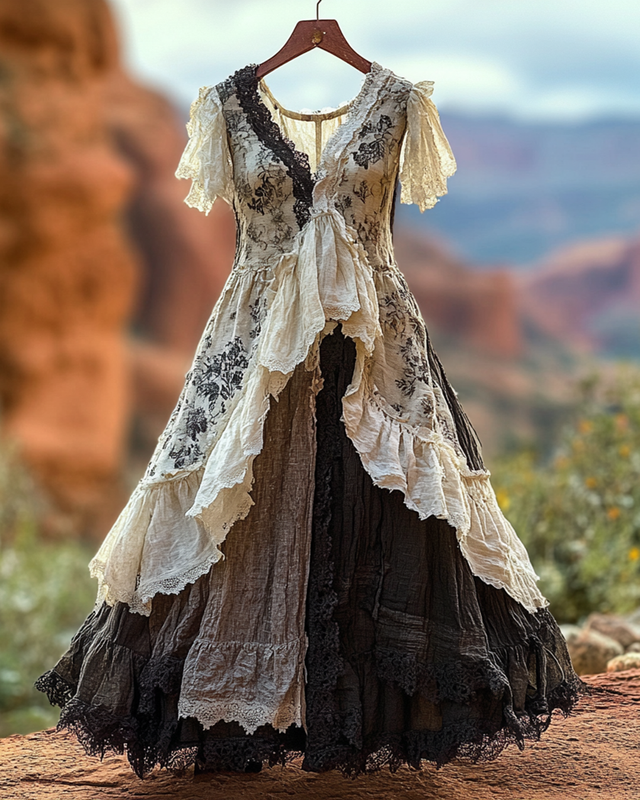 Boho Floral Pattern Linen Lace Patchwork Dress 6844