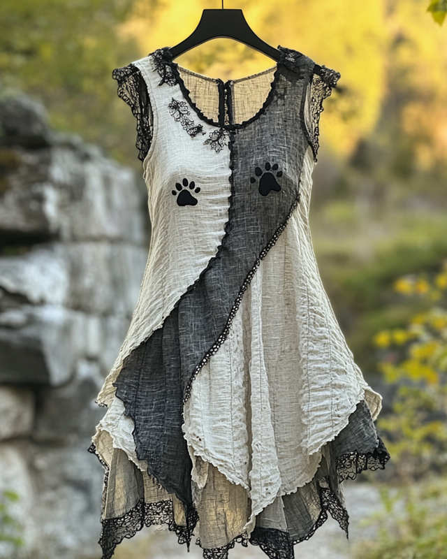 Summer Vintage Dog Paw Print Lace Patchwork Top c83f