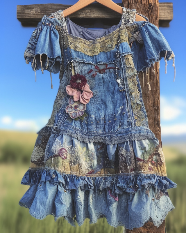 Flowers Denim Textile Lace Patchwork Tank Dress c4a4
