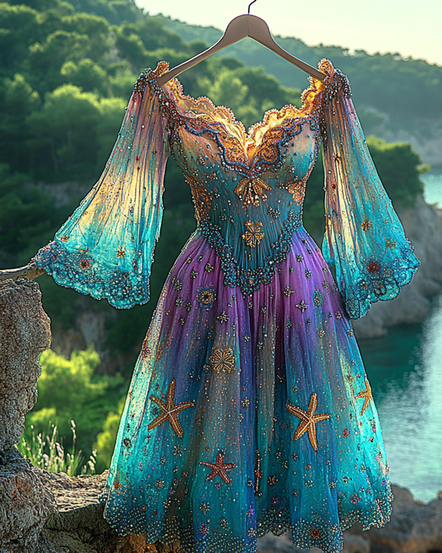 Summer Vacation Starfish Gradient Beaded Chiffon Dress 728d