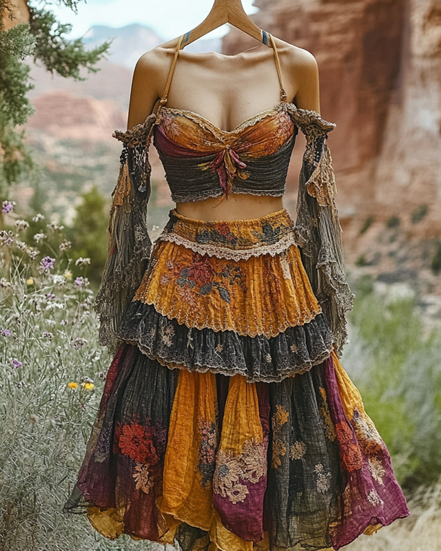 Summer Vintage Floral Lace Patchwork Top And Skirt Two-Piece Set fd1f