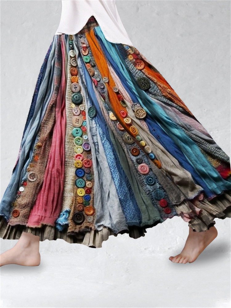 Boho Colorful Textile Flowy Linen Blend Wide Skirt f616