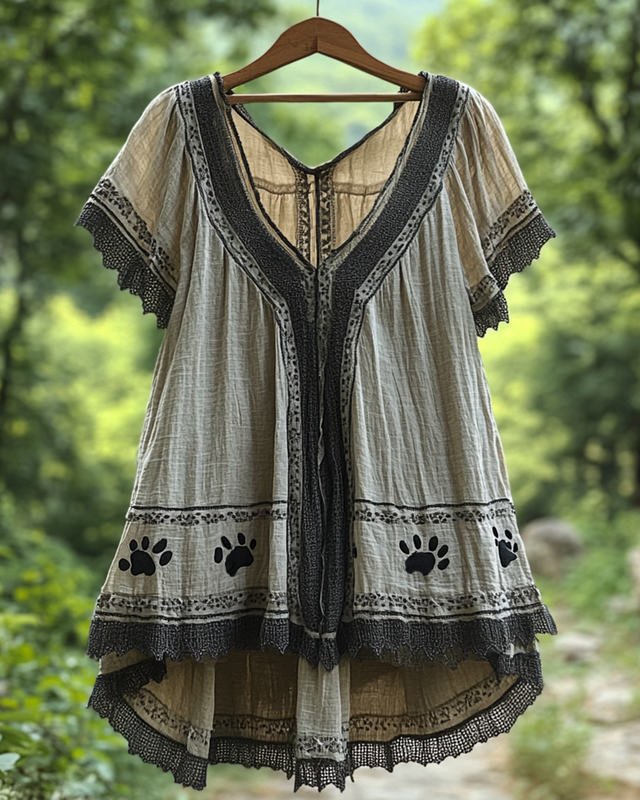 Summer Vintage Dog Paw Print Lace Patchwork Top 7bdc