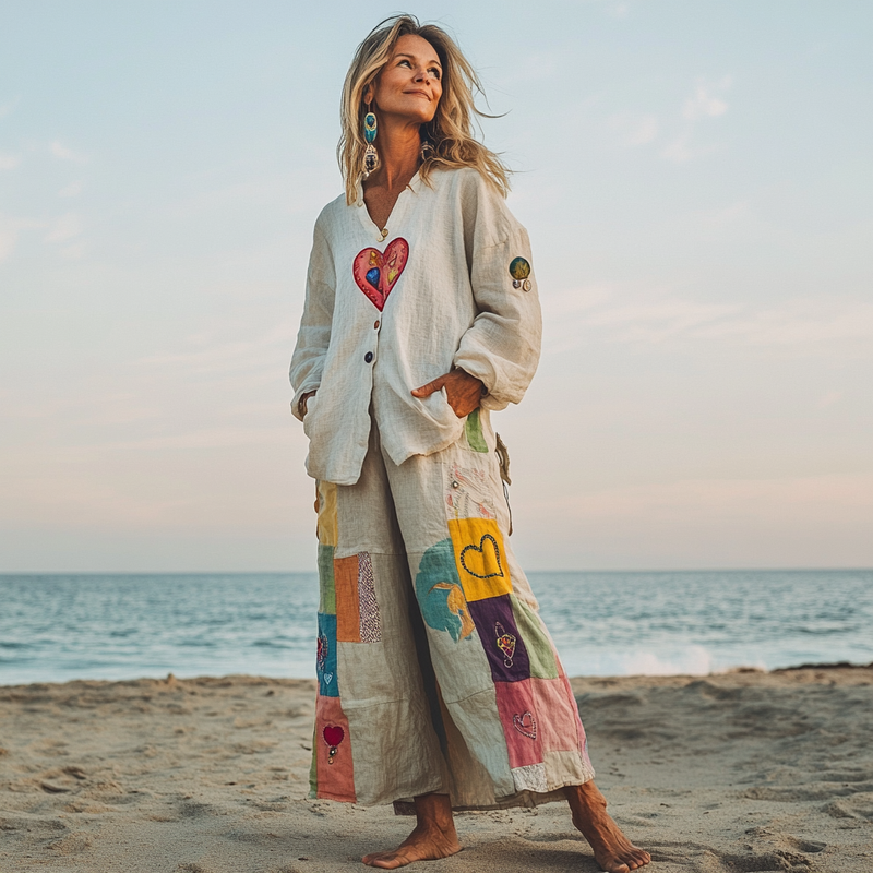 Women's Vintage Bohemian Patch Cotton And Linen Button-down Shirt d4c8