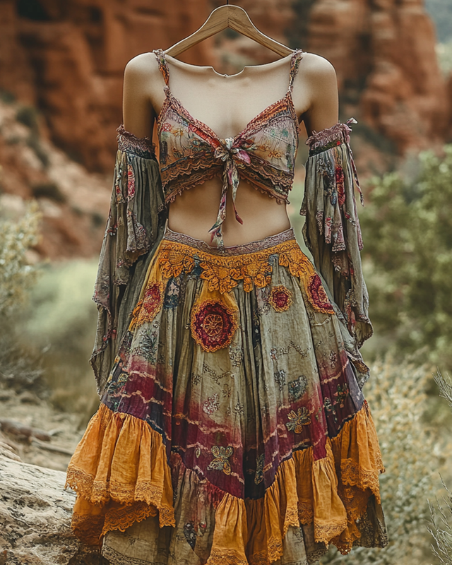 Summer Vintage Floral Lace Patchwork Top And Skirt Two-Piece Set d0fd