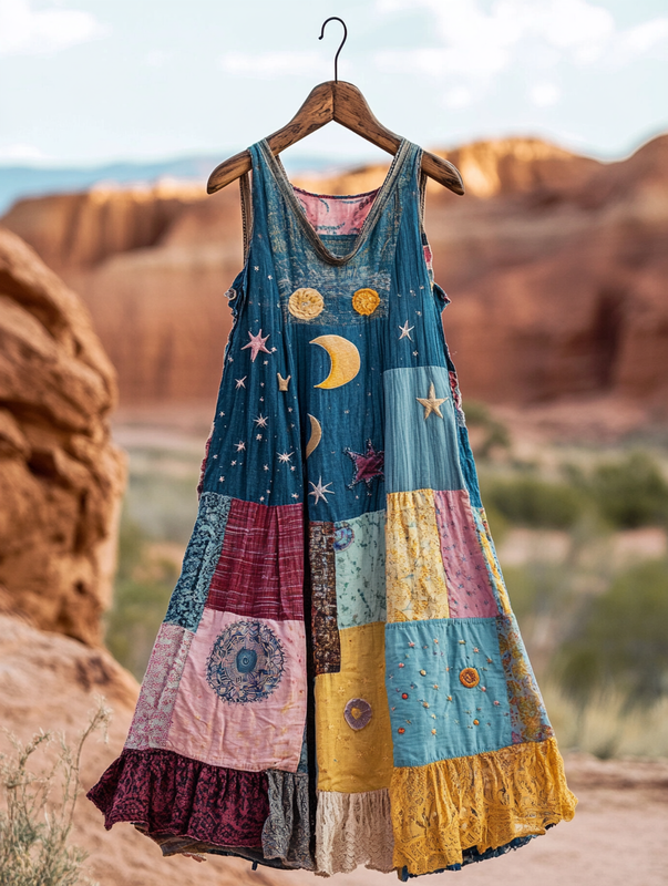 Summer colorful vacation patchwork cotton and linen contrast dress 773e