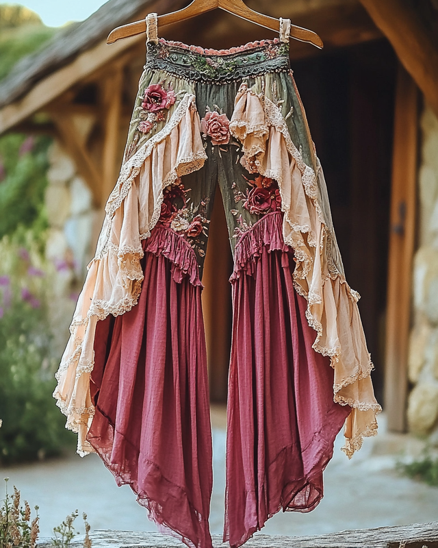 Boho Floral Pattern Lace Patchwork Linen Blend Pants