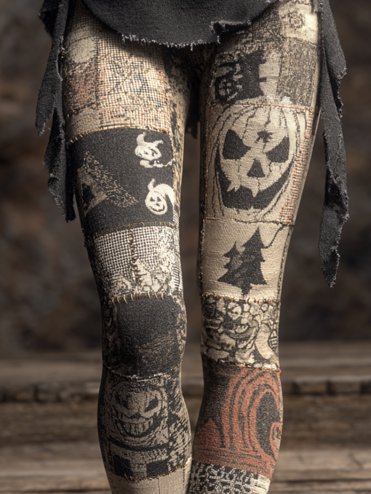 Halloween Pumpkin Spooky Face Patchwork Cozy Leggings