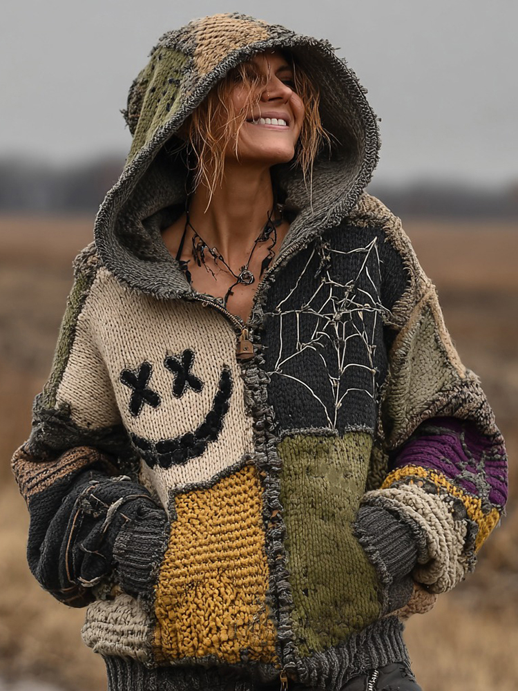 Halloween Spooky Smiley Face And Spiderweb Patchwork Design Cozy Knitted Zip-up Hooded Sweater