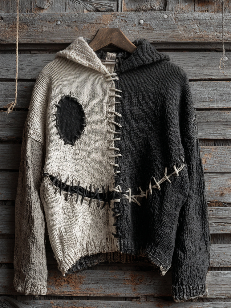 Vintage Patchwork Halloween Pumpkin Face Art Cozy Knit Hooded Sweater