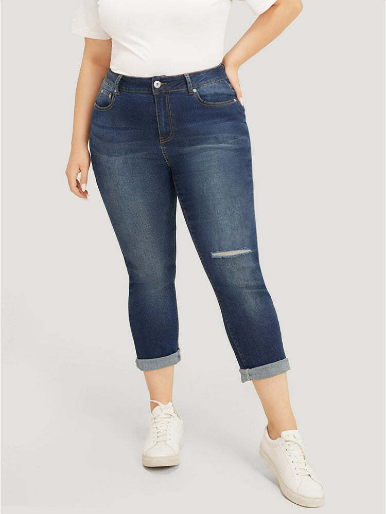 Very Stretchy High Rise Medium Wash Ripped Detail Cropped Jeans