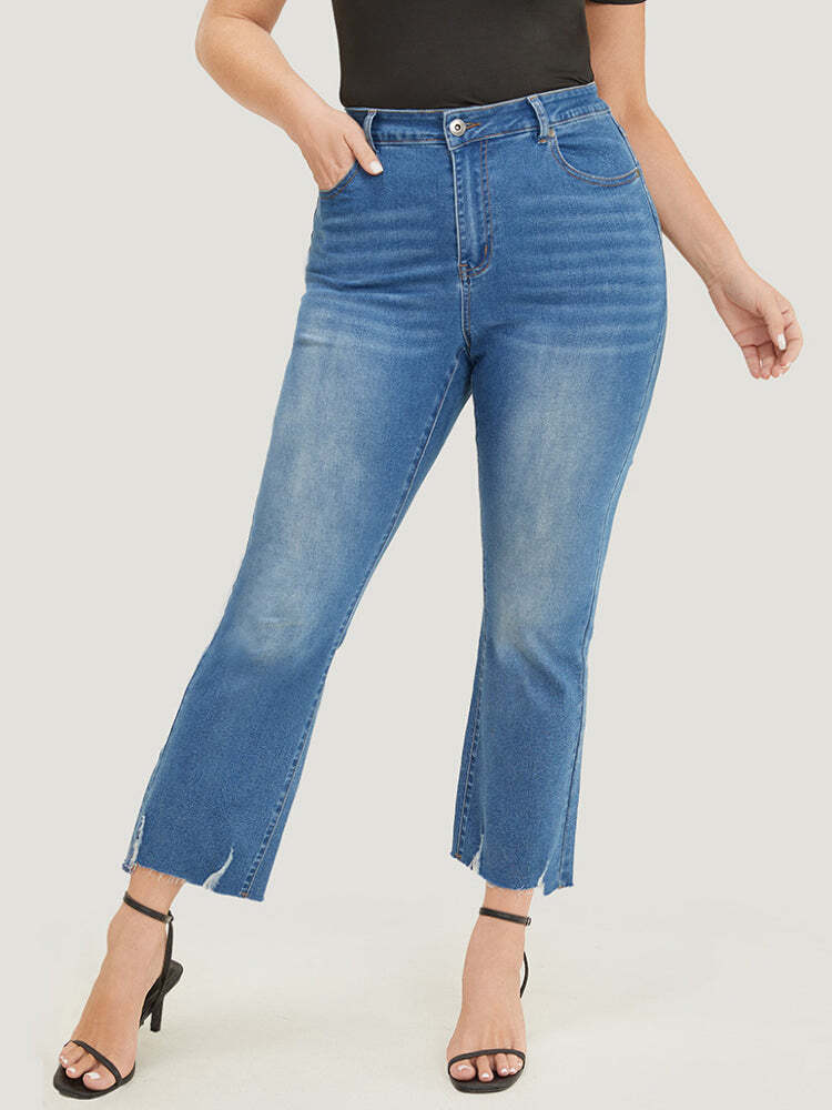 Bootcut Very Stretchy High Rise Medium Wash Distressed Hem Jeans