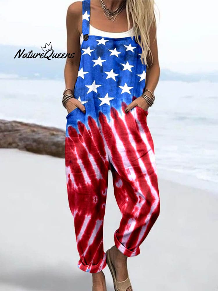 Wome'S American Flag Tie Dye Print Casual Cotton Wide Leg Jumpsuit